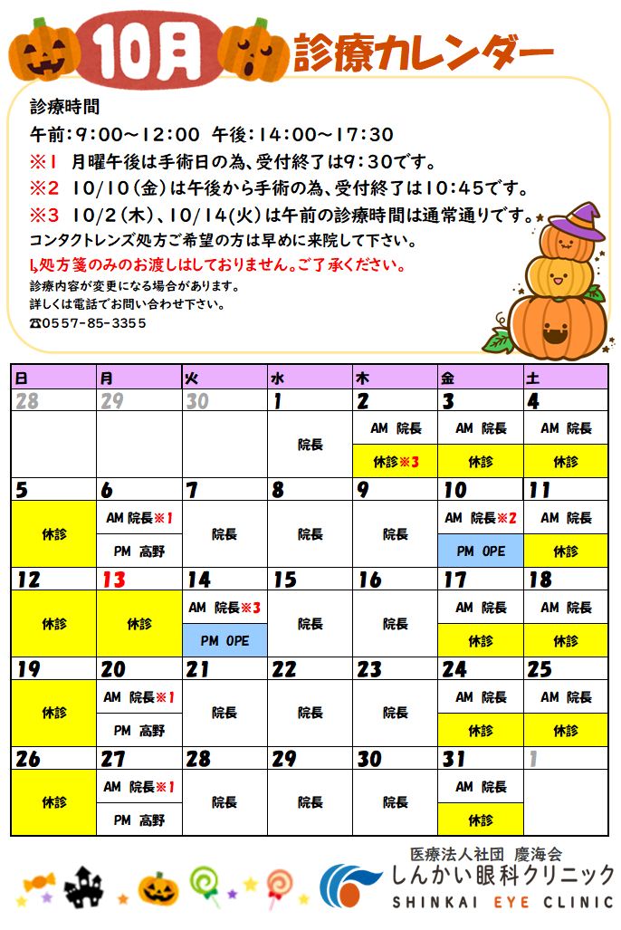 10月の診療カレンダーです。