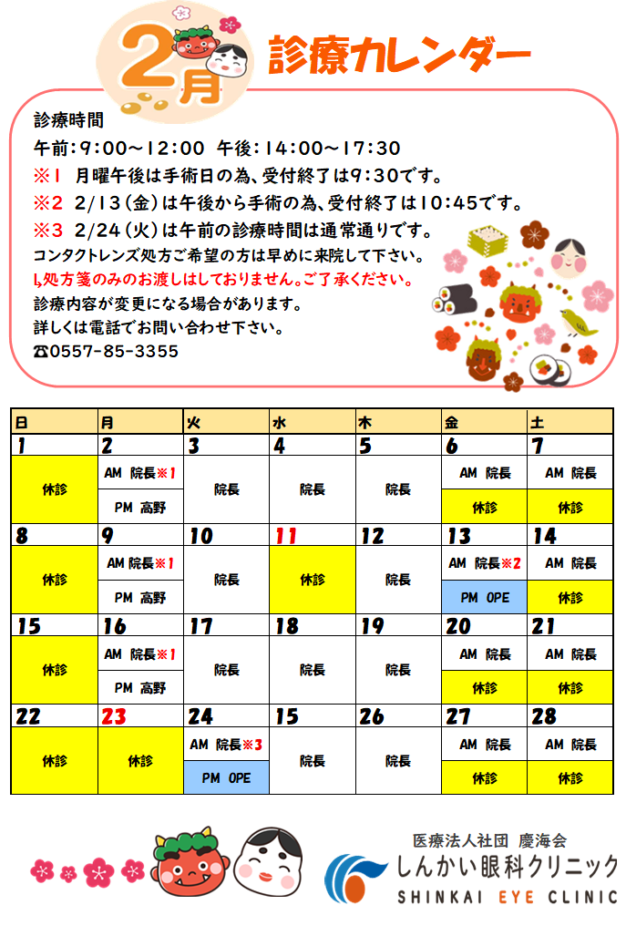 2月の診療カレンダーです🍫💝